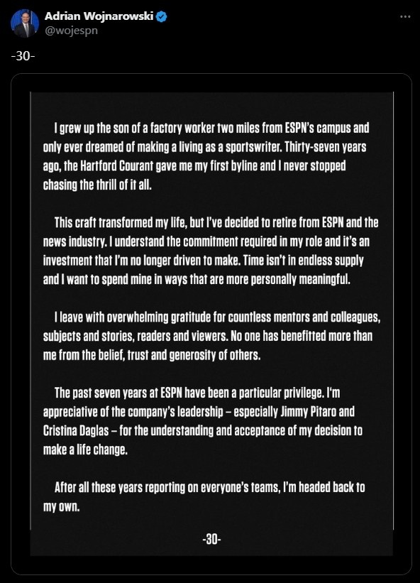 “这份工作改变了我的生活,但我决定从ESPN和新闻行业退休。我理解我的角色所要承担的责任。这是一项我不再被迫做出的投资。时间是无尽的,我想以更有个人意义的方式度过我的时间。
