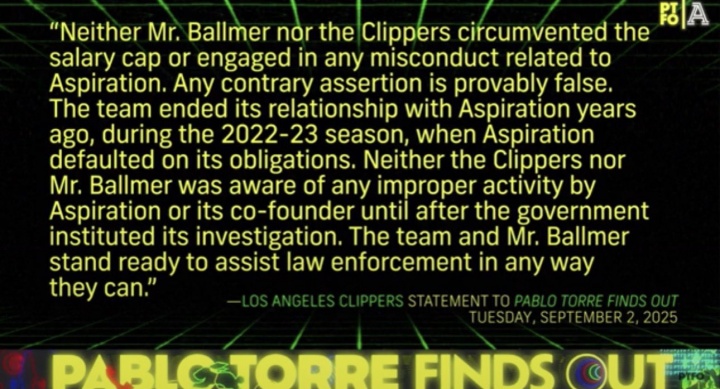 快船官方发布声明回应了此事:“鲍尔默先生及快船从未通过Aspiration公司规避工资帽或从事任何不当行为,任何反对主张均可被证明为不实。”